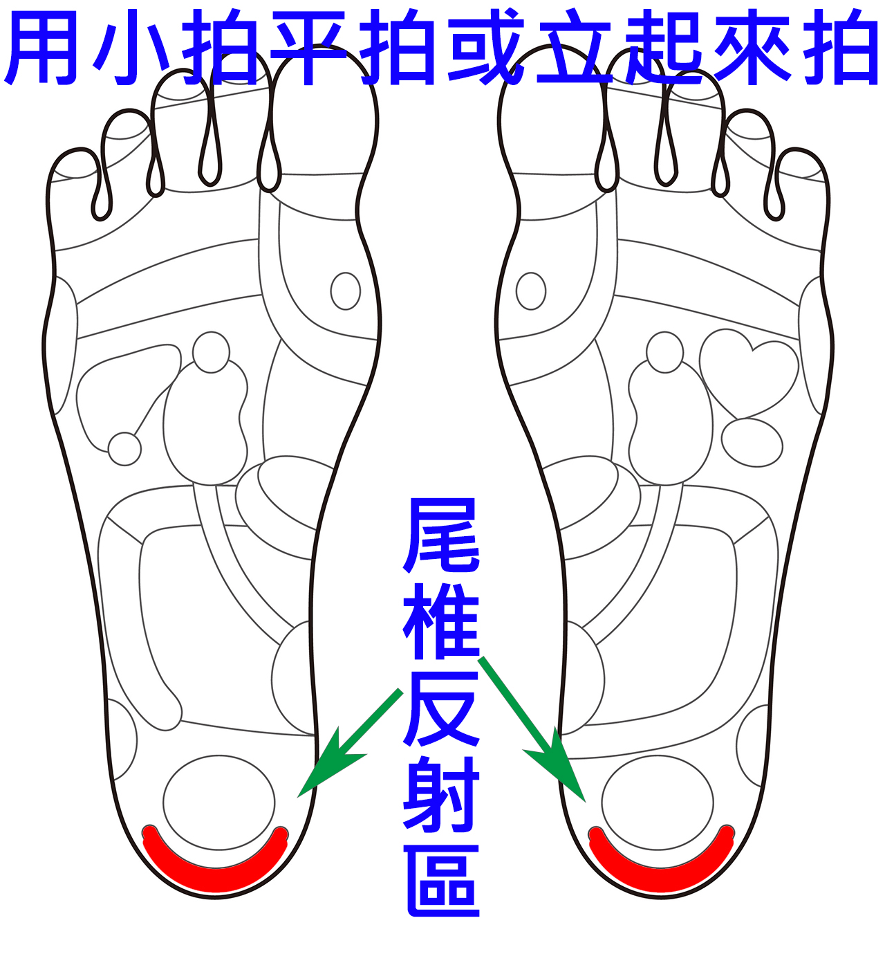 尾椎跌坐受傷時,新傷不拍患處,可以拍腳跟處+承山改善;