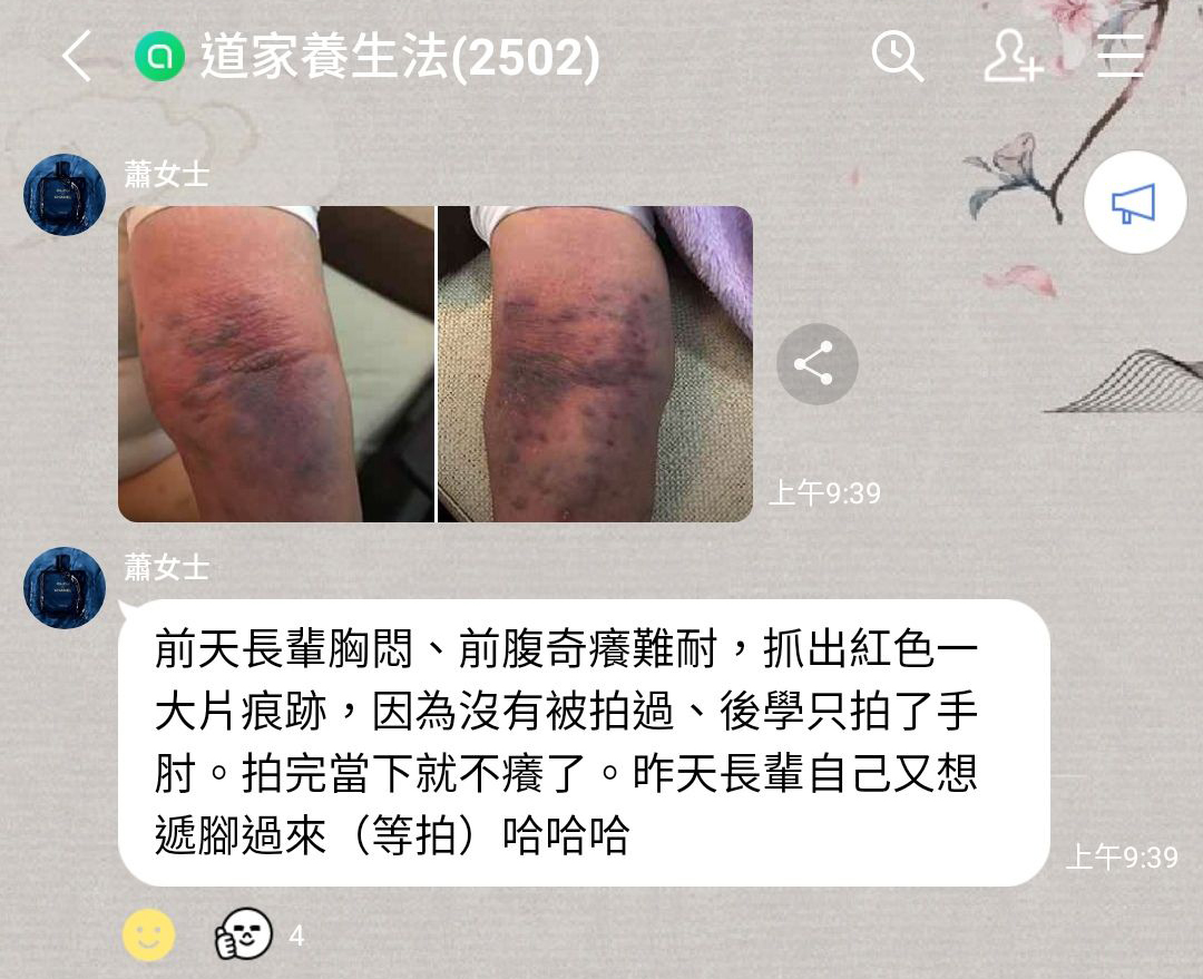 心臟經絡的拍打,最常回饋的就是拍後在痧退前的7-10天內,常常會有突然的心跳快,或是胸痛,或是胸悶,或是喘...等;