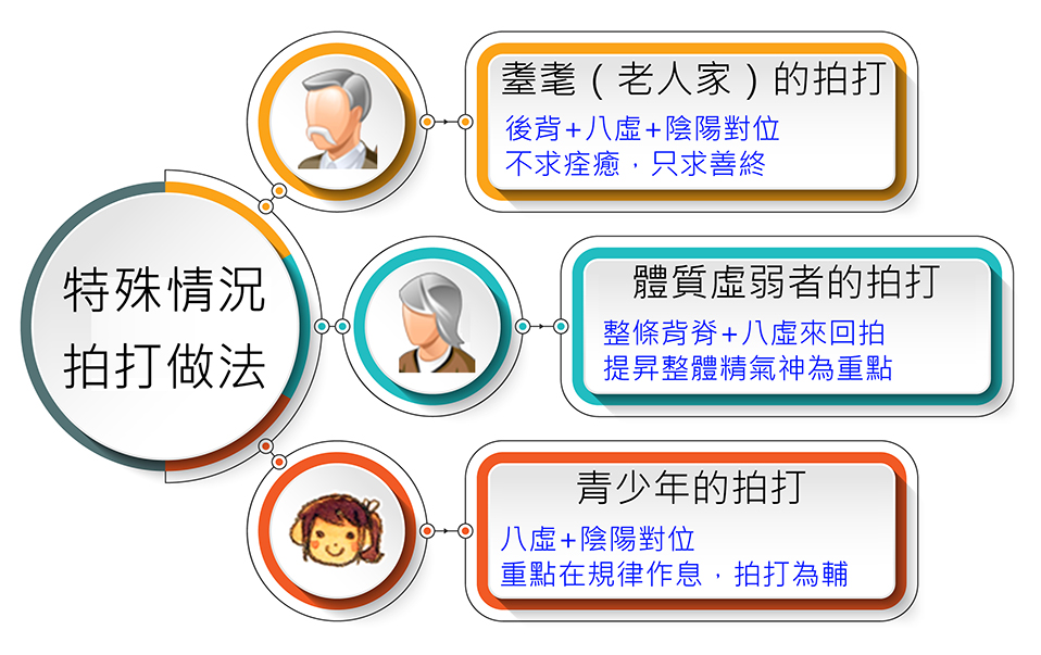 ① 虛弱的人,除了拍打的力道要拿捏好外,拍打的時間是很重要的;