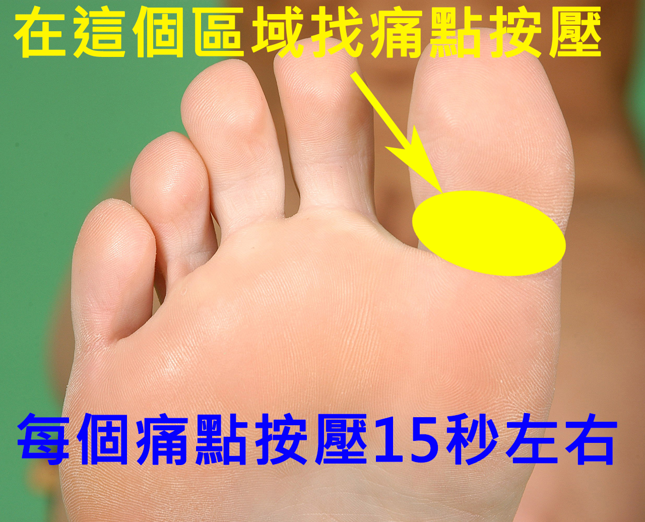 用手或工具,在腳大拇指頸部的區域,尤其是內側,找痛點按壓;