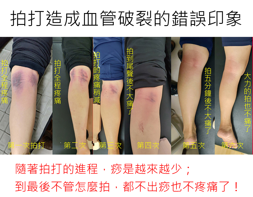 答:這種沒有先引氣血到拍打點,一開始就大力的拍,這樣的拍打做法會有受傷的成份在裏頭,道家拍法一開始都是輕拍引氣血的。