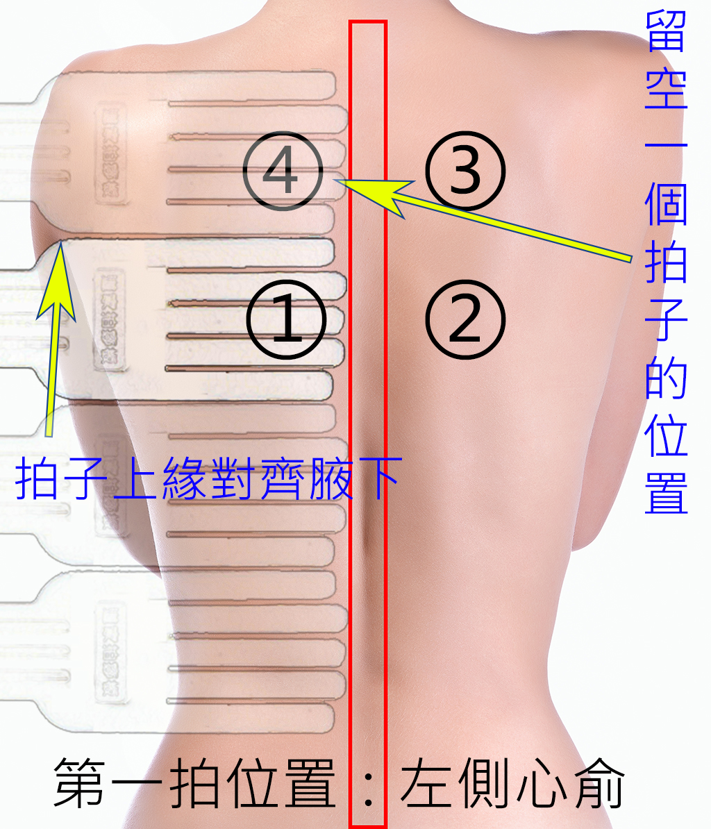 第一個拍打的位置:心前穴,左側拍完拍右側,每個位置拍:8~10分鐘