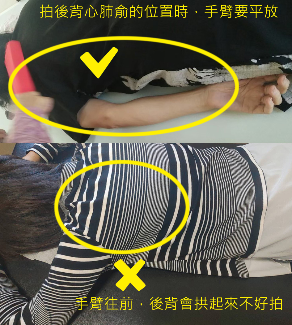 後背心肺俞穴的四個位置,手要平放; 如果手臂往前放時,肩肘會拱起來,這樣心肺俞的位置會凹陷下去,拍打的效果不好;