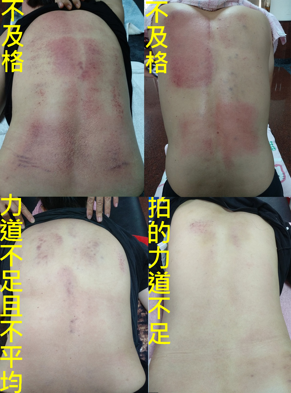 剛拍打完,拍打的位置出痧,看起來不明顯,待第二天後就會如下圖般的黑了,這很正常;
