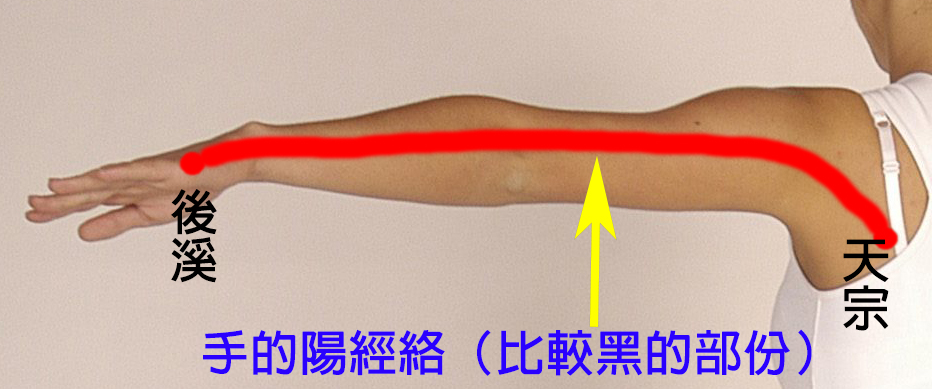 這是小腸經瘀堵造成的居多,請拍打手的陽面(曬得到太陽,比較黑的那一側),從天宗開始拍,一路到小手指的後溪穴,拍後溪的位置時,用小拍立起來拍