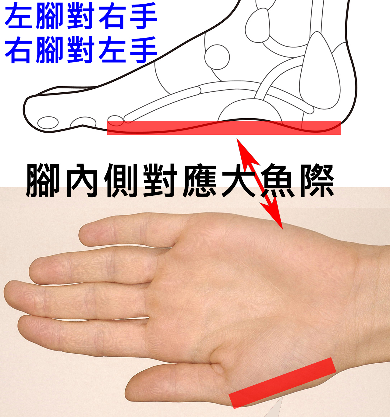 ① 陰陽對位:四疊拍拍腳背對應手的外緣位置;