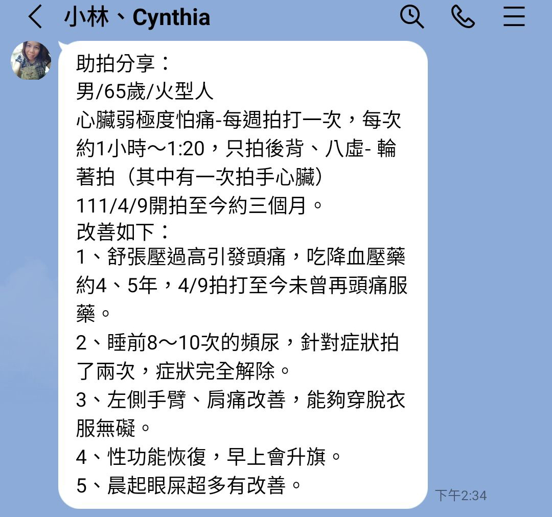 要請受拍者在家,有時間就要拍這些位置,尤其是病灶臟腑的經絡,可以天天拍,一直拍到完全恢復為止;