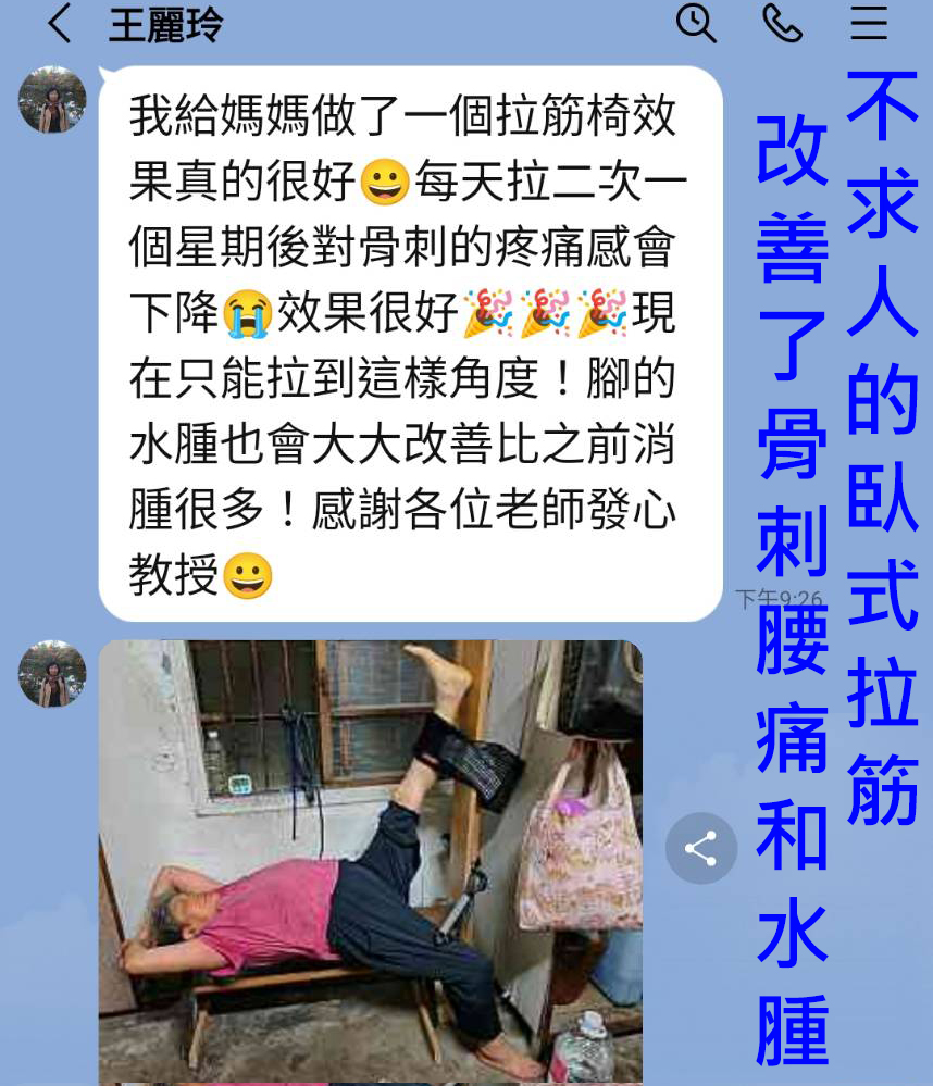 ②拉筋時姿勢要正確為先,拉一分鐘也可以,如果姿勢不正確,拉筋反而不好。正確的姿勢是上舉的腳,大腿要靠著豎起來的那根杆子,膝蓋會彎沒有關係,看能伸多直就多直,最好能有個鬆緊帶固定,屁股要貼著椅面,不能懸空,兩手要儘量伸直能貼著耳朵為佳,放不下的可以手拿著裝水的寶特瓶下壓。隻要您的動作是標準的,您就不用怕會拉受傷。
