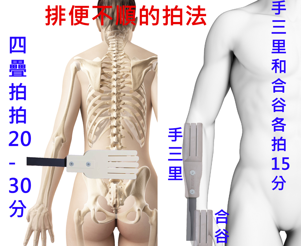 大腸病症拍打的位置:後背的大腸俞(重點),手大腸經,尾椎倒拍(直腸癌);