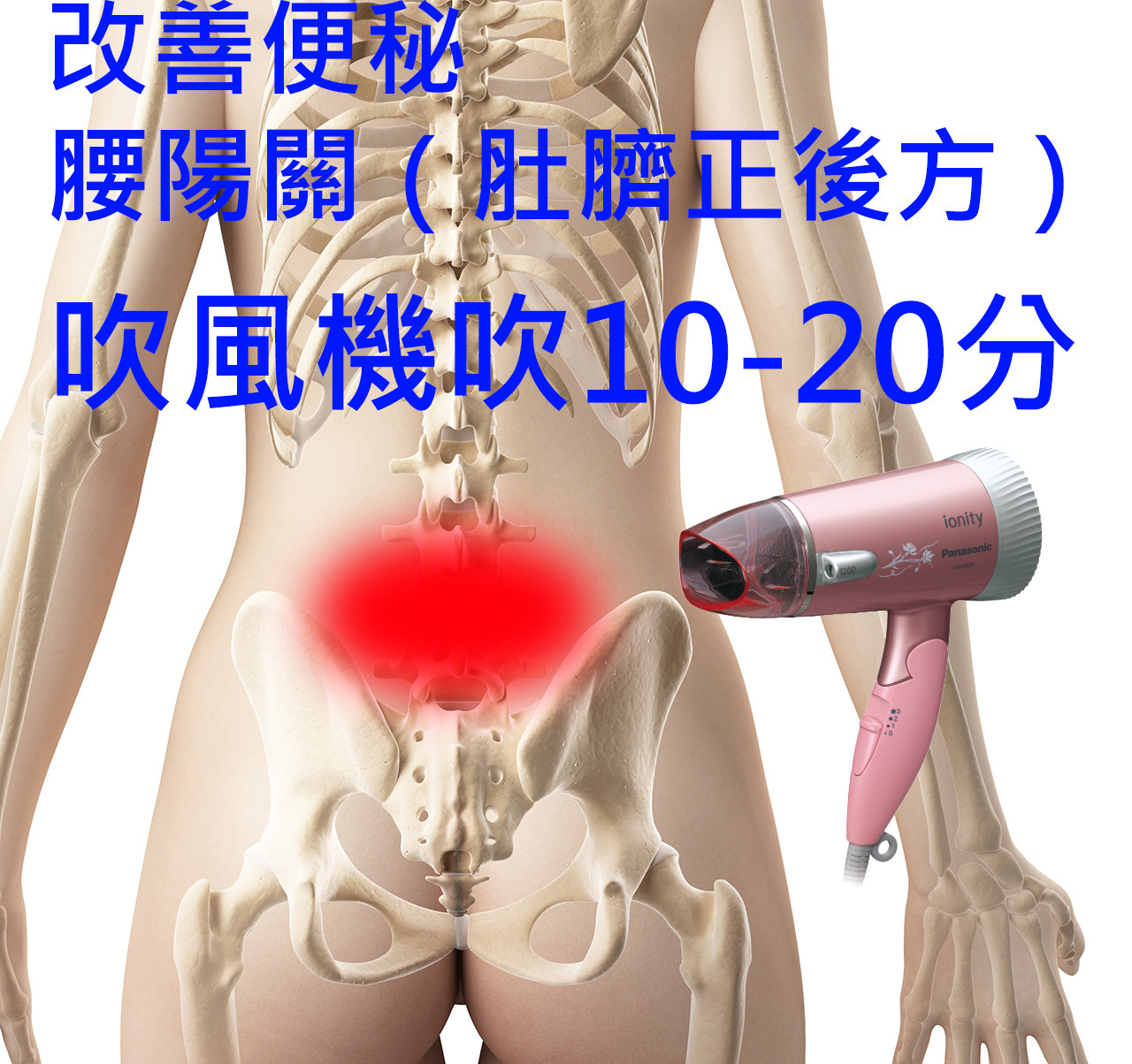 可以用吹風機開小熱風吹腰陽關的位置(肚臍的正後方);