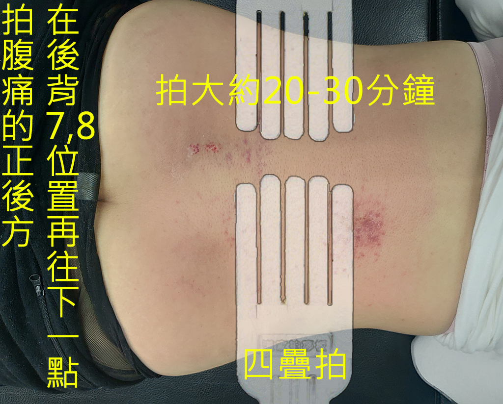 拍腹痛的正後方,拍打的時間是重點,通常能拍到20-30分為佳;