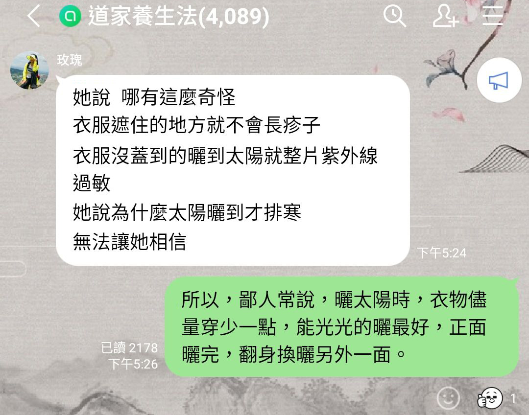 ★ 日曬的成果可以在晚上睡覺時來驗收,曬個幾天後,晚上就不用吹冷氣了,或是說吹冷氣時溫度要一直調高,再多曬個幾天後,不要說冷氣,連風扇都可以不用吹,再接著曬一陣子後,三伏天睡覺都需要蓋被子。這個時候的人,身上的寒氣就曬光了。