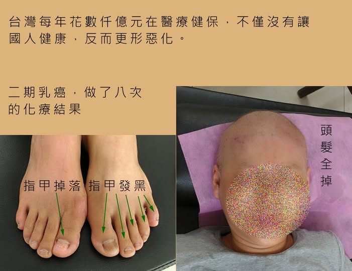 現在我們來看看附圖,做了化療後的慘狀,頭髮全掉,指甲有的發黑,有的掉落。
