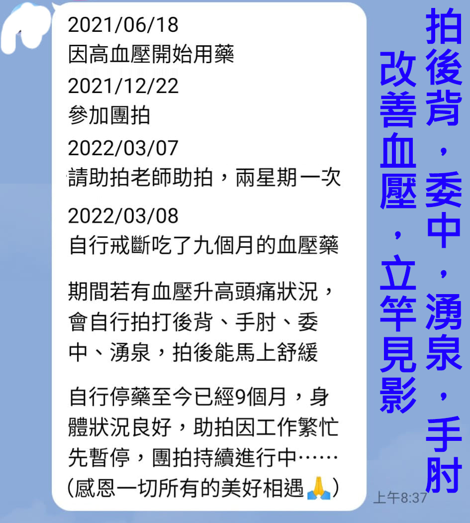 其實不隻是拍打的途中或拍後,血壓都不會昇高,相反的血壓反而會變好轉