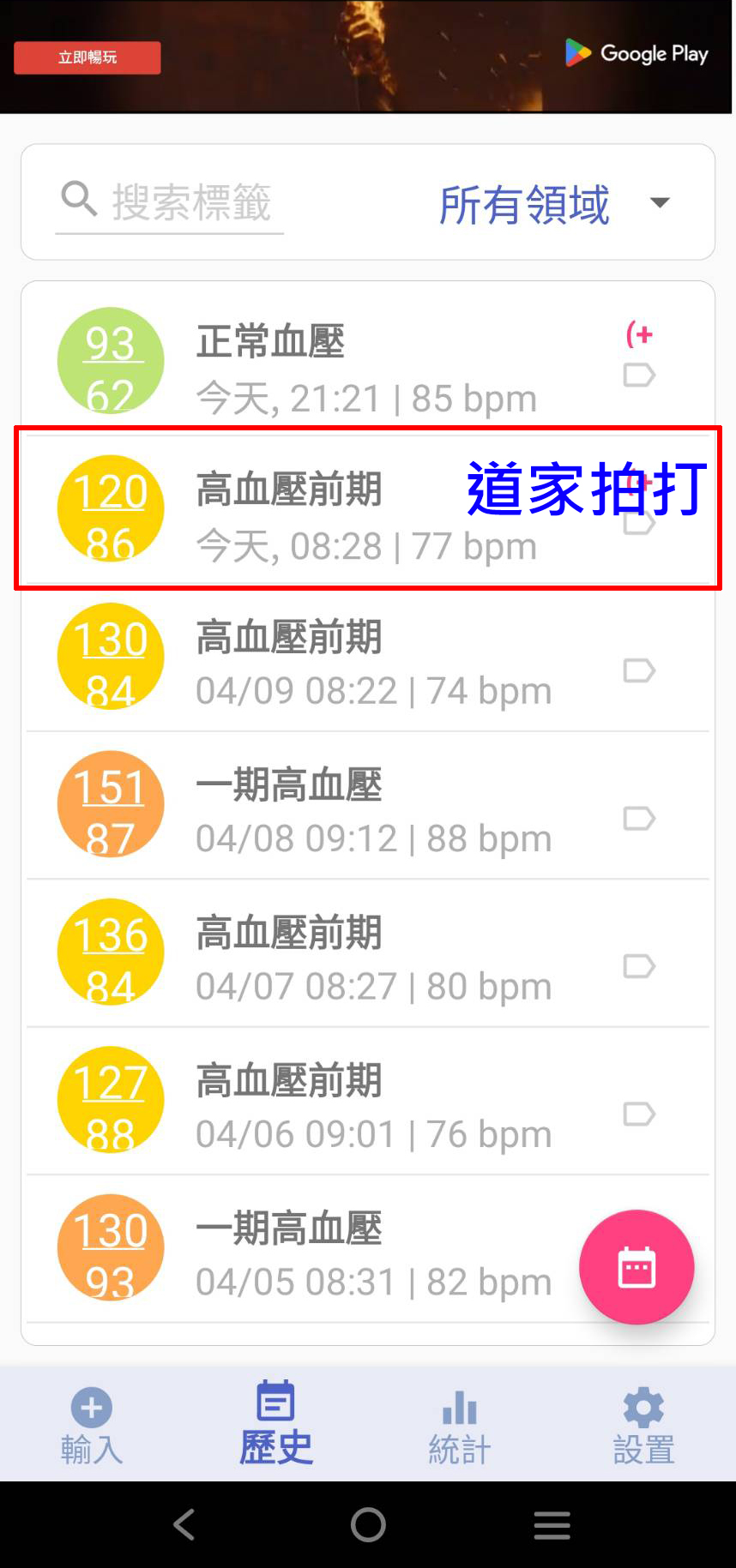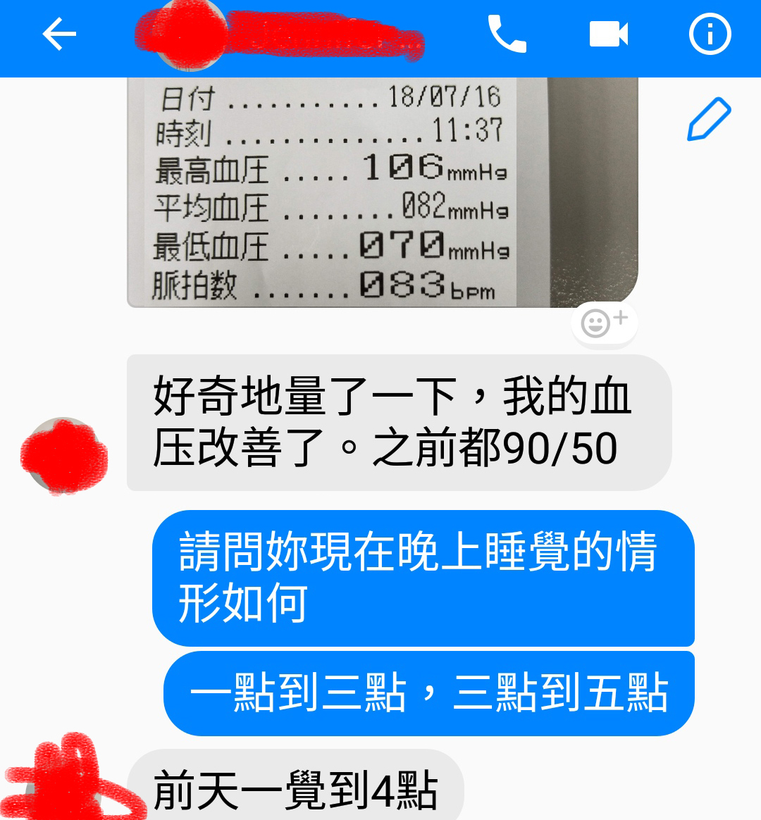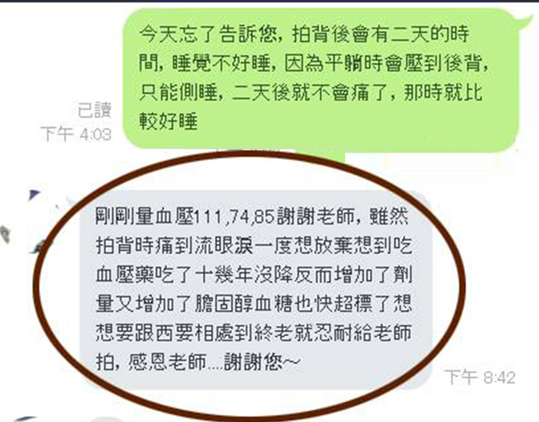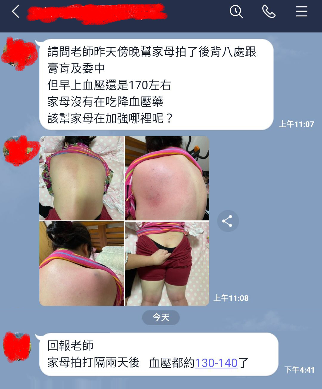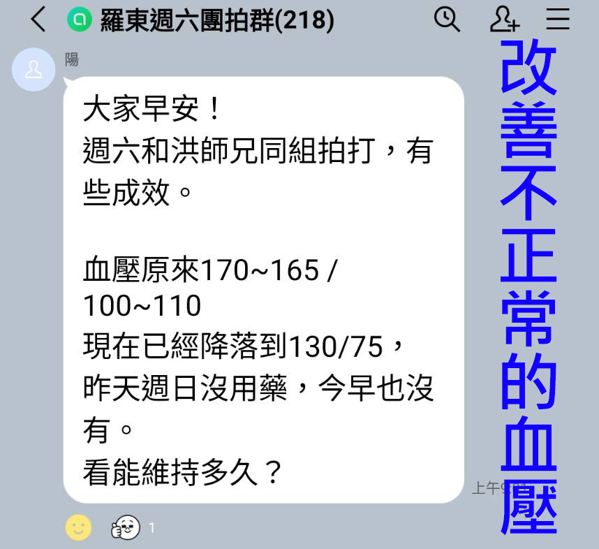 女,65歲:經常是150-180的血壓,用道家拍法拍一次(後背+委中+湧泉+手肘),後,第三天以後就是維持在130-140之間了。