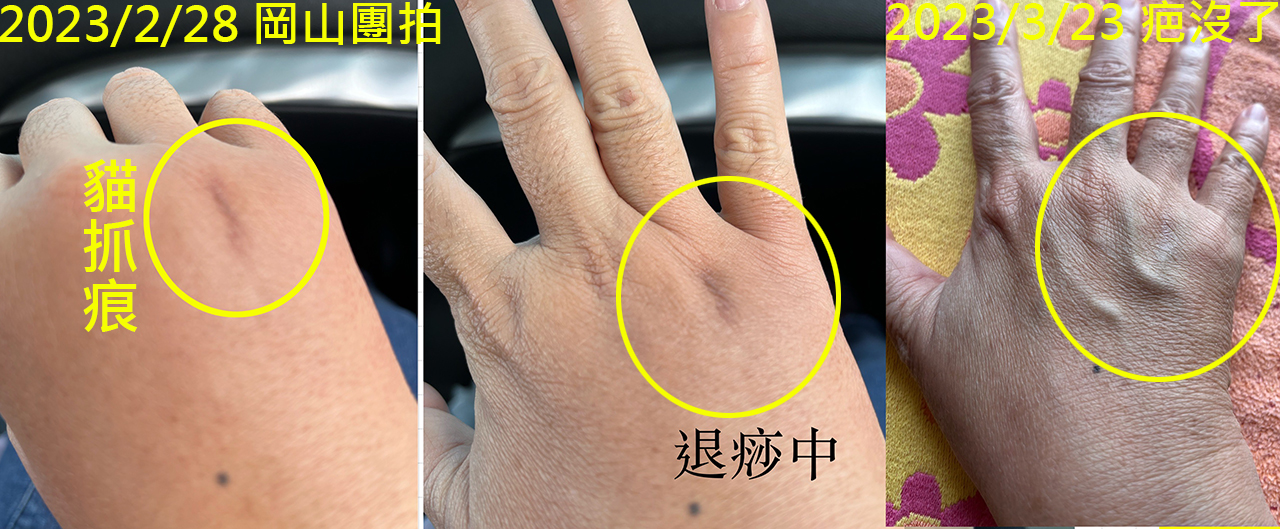 於是我們就開始,連續六次的拍打,一開始她忍痛,兩次後開始告訴我,手臂肌肉變鬆軟,舉手往高處放東西變容易,手部的冰冷改善了。