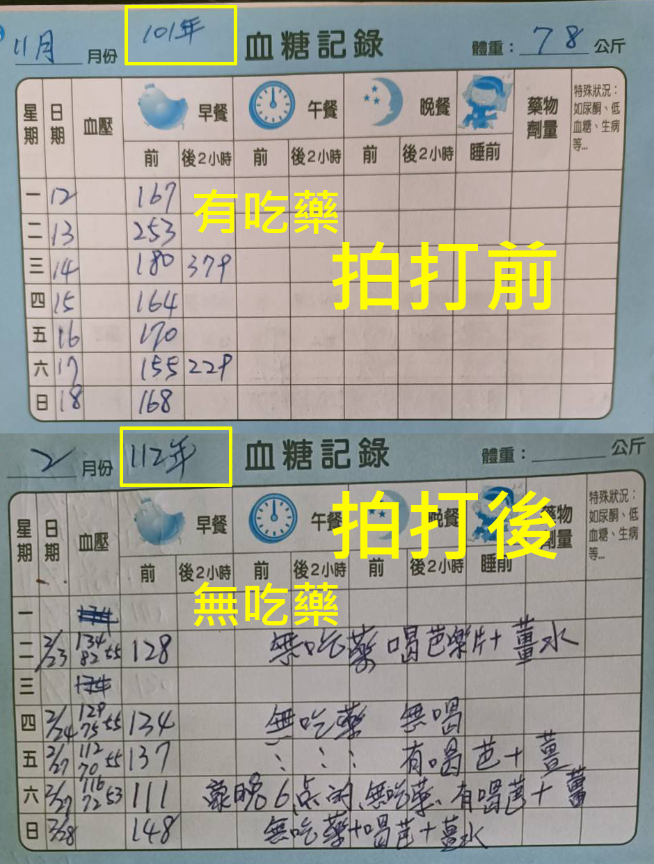 這位拍友改善了十多年來的糖尿病症狀,附圖:記錄的血糖值數字雖不是很漂亮;