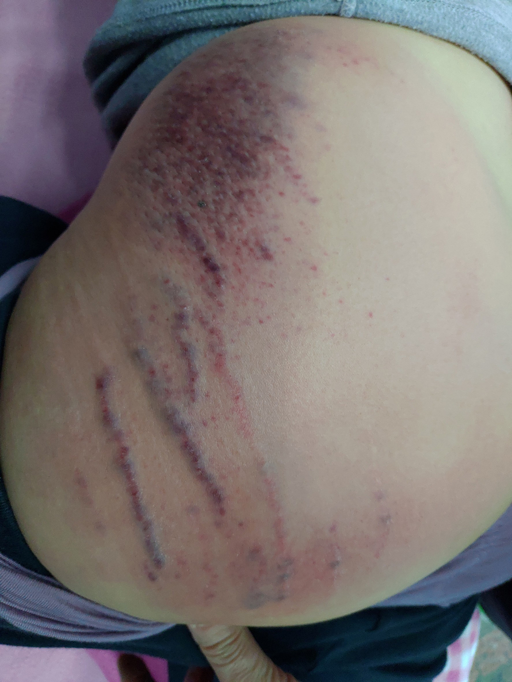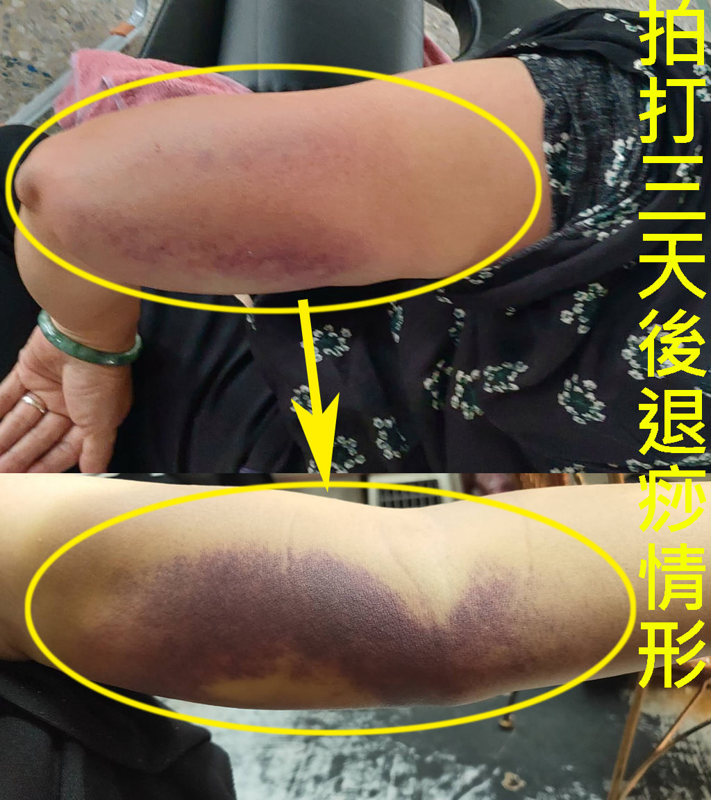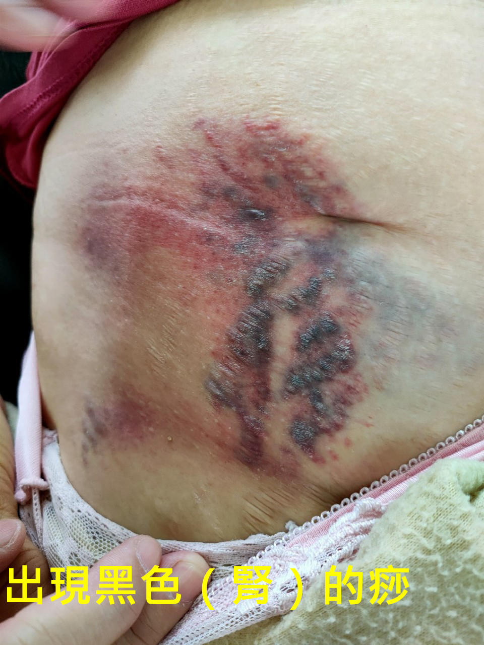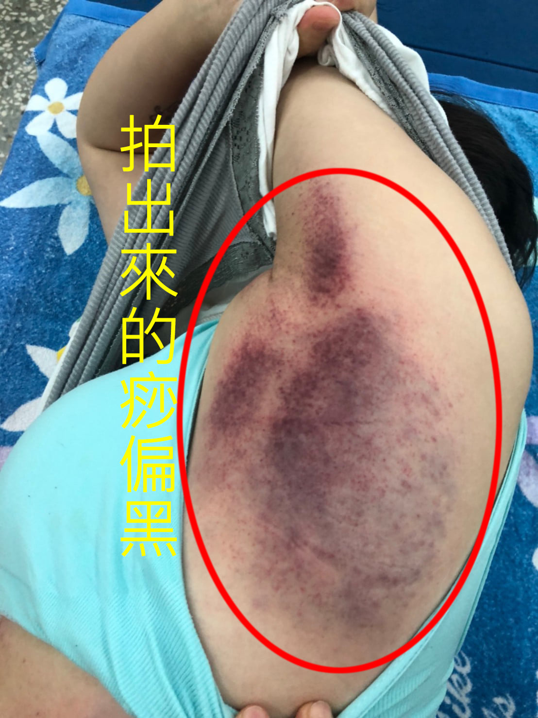 拍打後的出痧情形,看起來就好像是皮下出血一樣;
