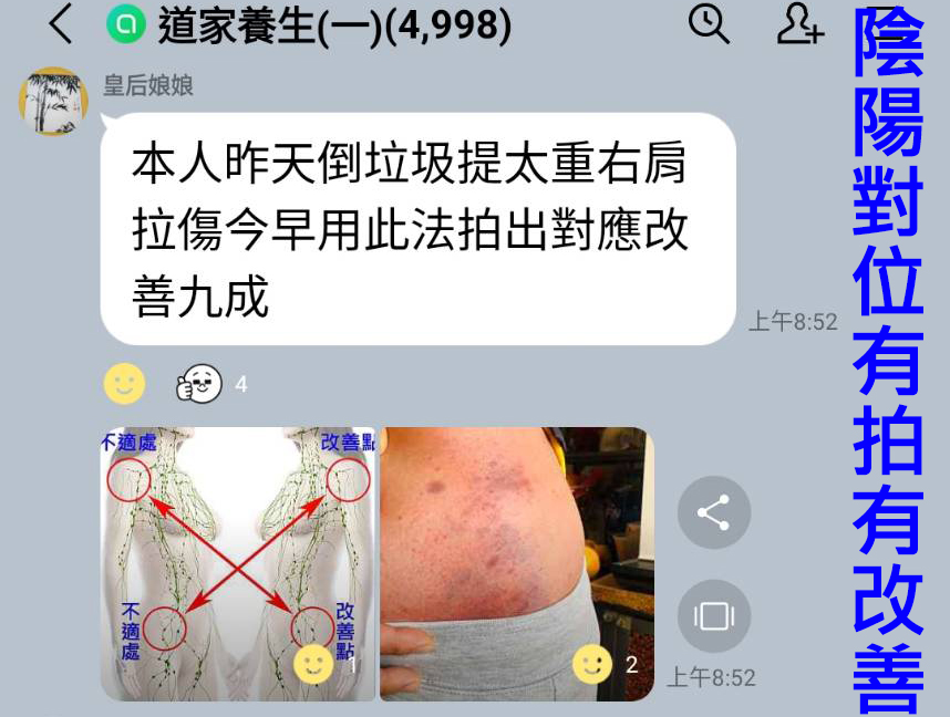 用道家拍法的三板斧改善,只拍了陰陽對位的右腳足三里,就改善了近九成;