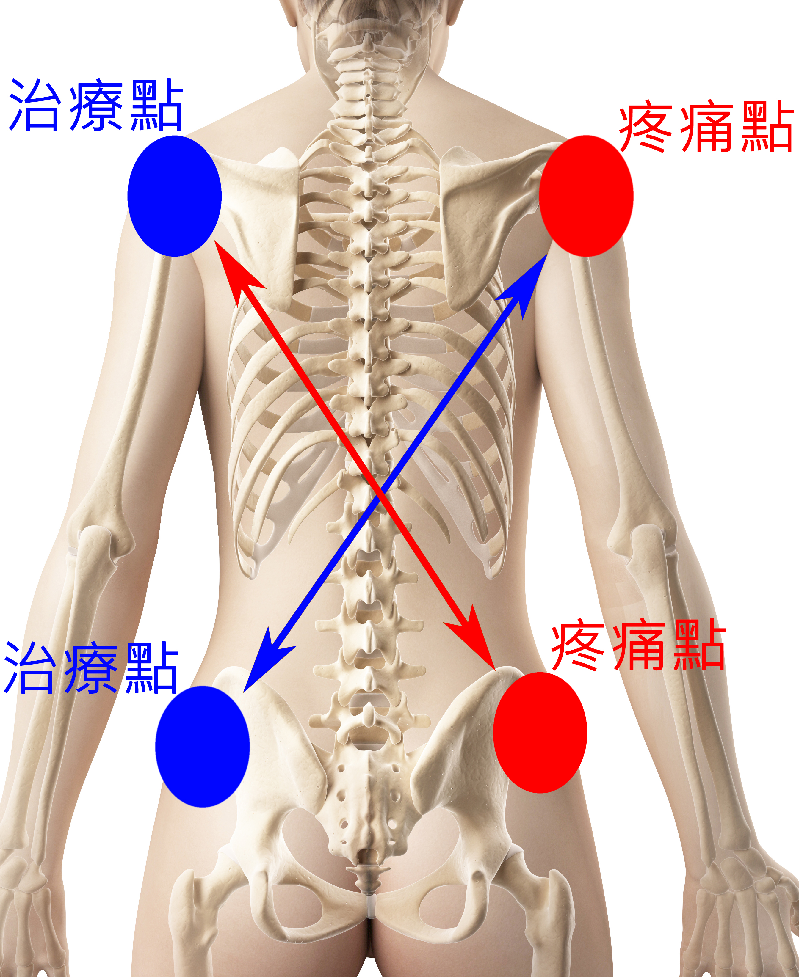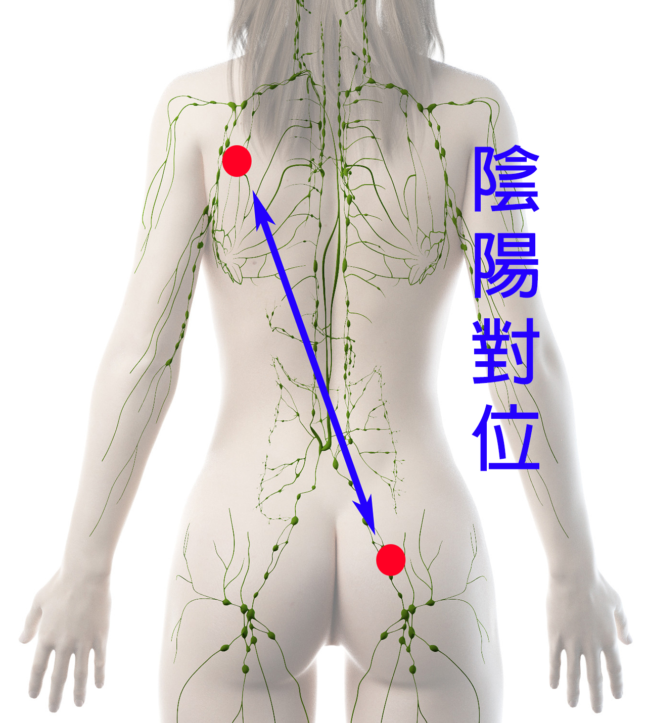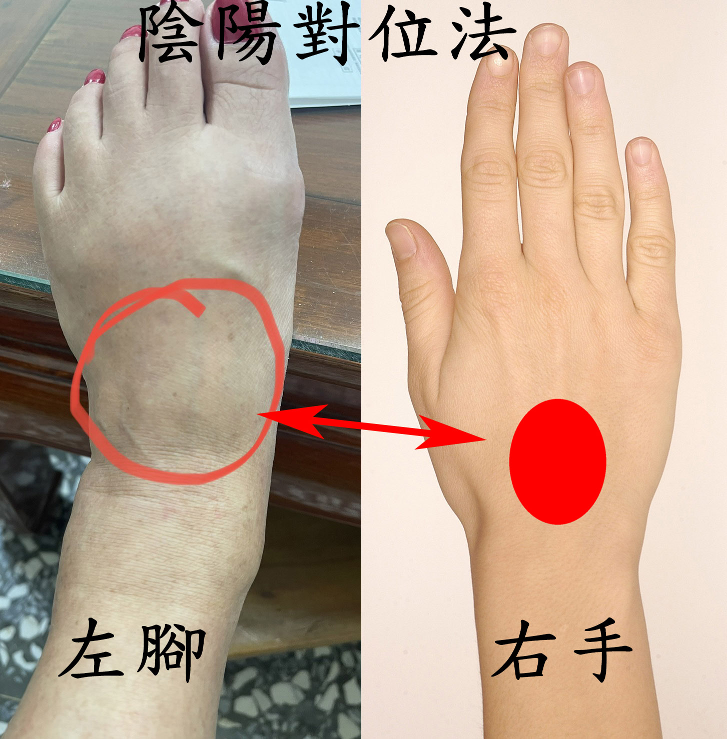 有某個特定的點,有不適的症狀時,可以使用陰陽對位的方式,效果也很不錯,在不適的對應點找痛點拍,如下圖: