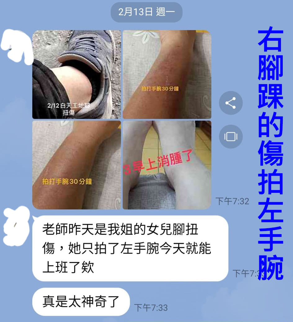 腳踝扭傷,拍對側的手腕的對應位置,隔天就消腫了。