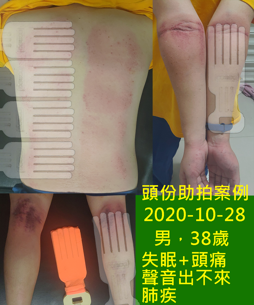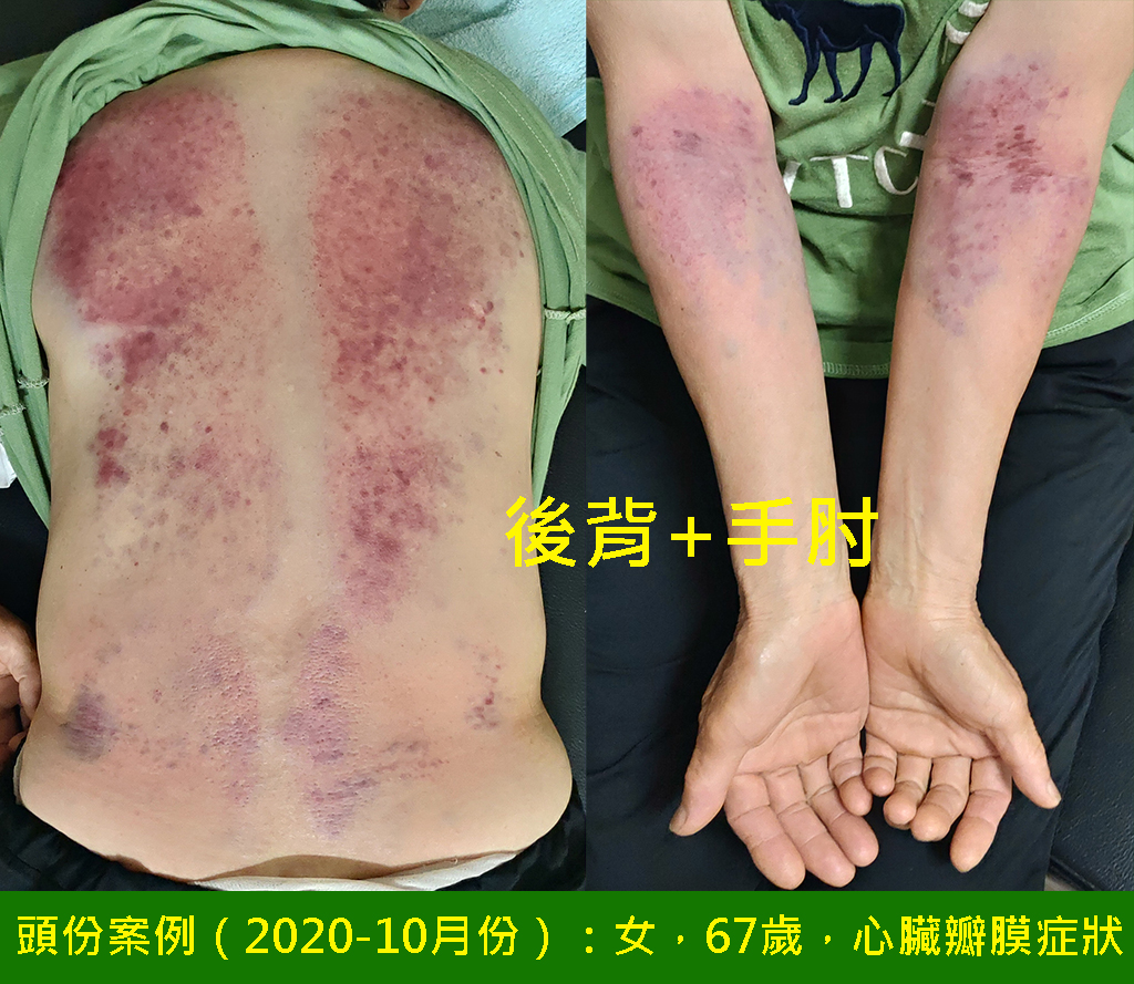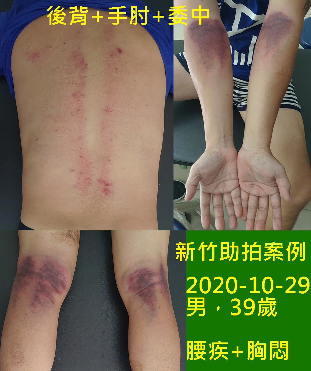 剛拍打完,拍打的位置出痧,看起來不明顯,待第二天後就會如下圖般的黑了,這很正常;