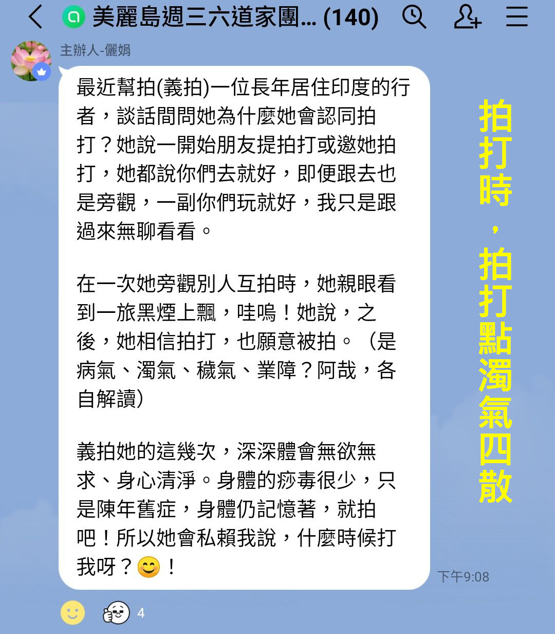 在她参加了九次的道家拍團拍後,有了感悟(如附圖)!