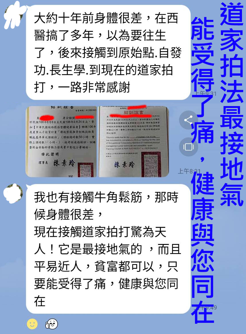 而道家拍法是讓整個人全部恢復的健康,包含月事,睡眠,胸悶心悸,血糖…全部都一起恢復,好吃好睡,周身沒有什麼不適的症狀。