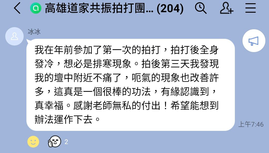 上週團拍時,她拍了脾胃經,所以今天拍了第二把斧頭的腰陽關和尾椎(氣血流注),拍完後,當場腳踝的不適就消失了。
