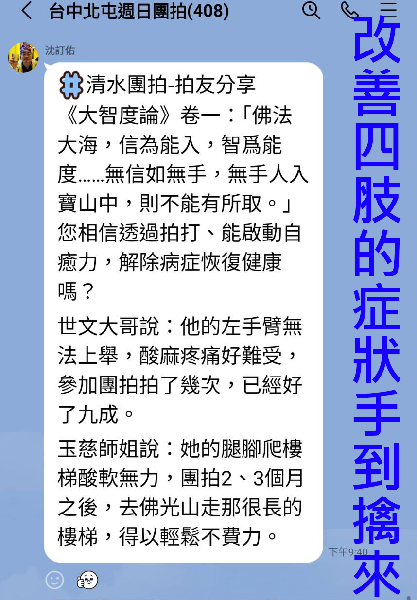 此時用道家的厚實拍法清,每個點的拍打時間,可以40分鐘起跳,需要拍打多次,拍到完全不痛為止;