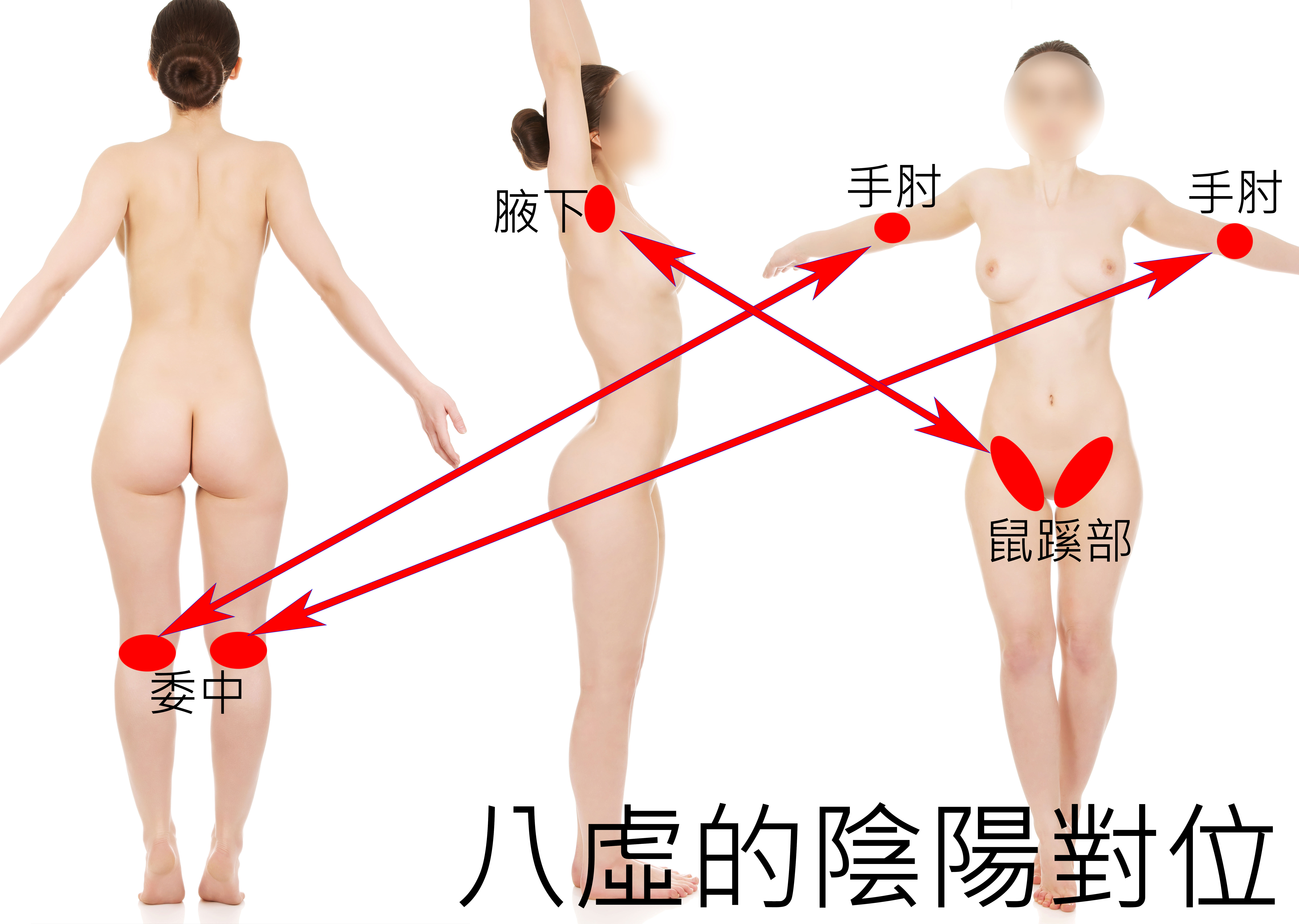 八虛,顧名思義,就是八個位置,手肘,腋下,鼠蹊部和委中,合計8個位置。
