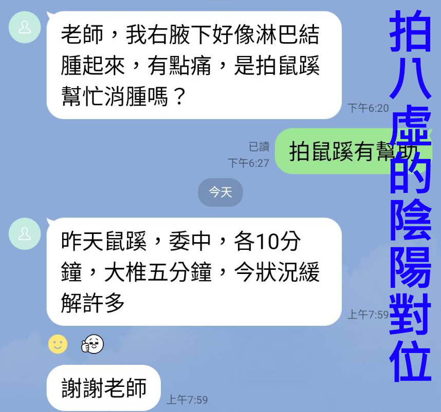 此時只要把對應臟腑的八虛位置,給拍到不痛後,症狀就可以立即的緩解。