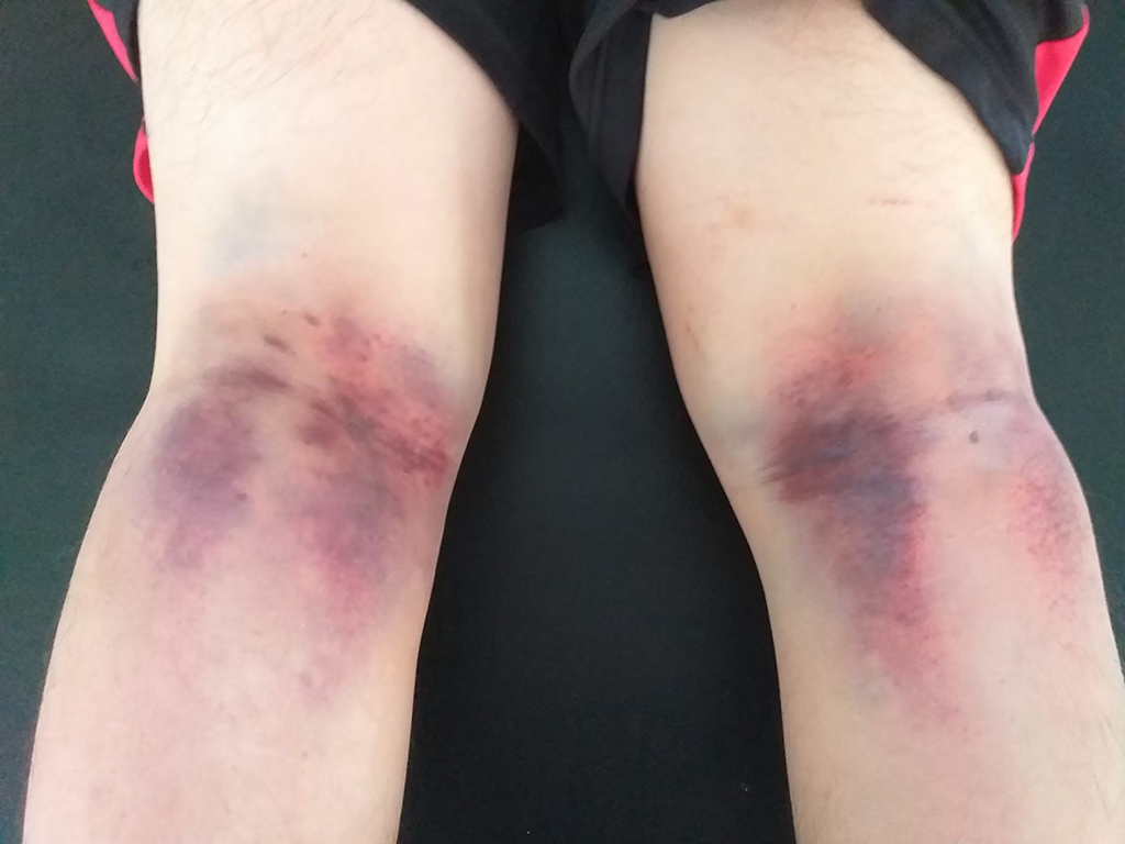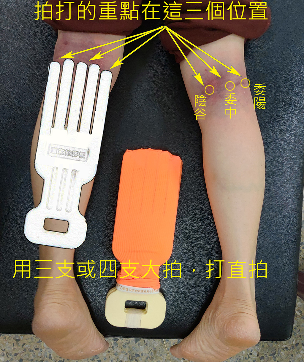 如果非常怕痛的人,一開始拍委中時,可以用手拍,待拍個幾次後,再用厚實的工具拍打。