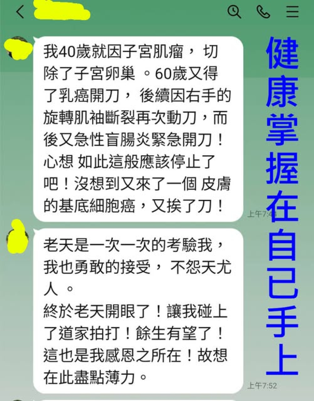 幸運的她,接觸到道家拍法後,積極的自救而恢復了健康,現在的她精力充沛,每天到處趴趴走,過著自由自在的晚年生活;