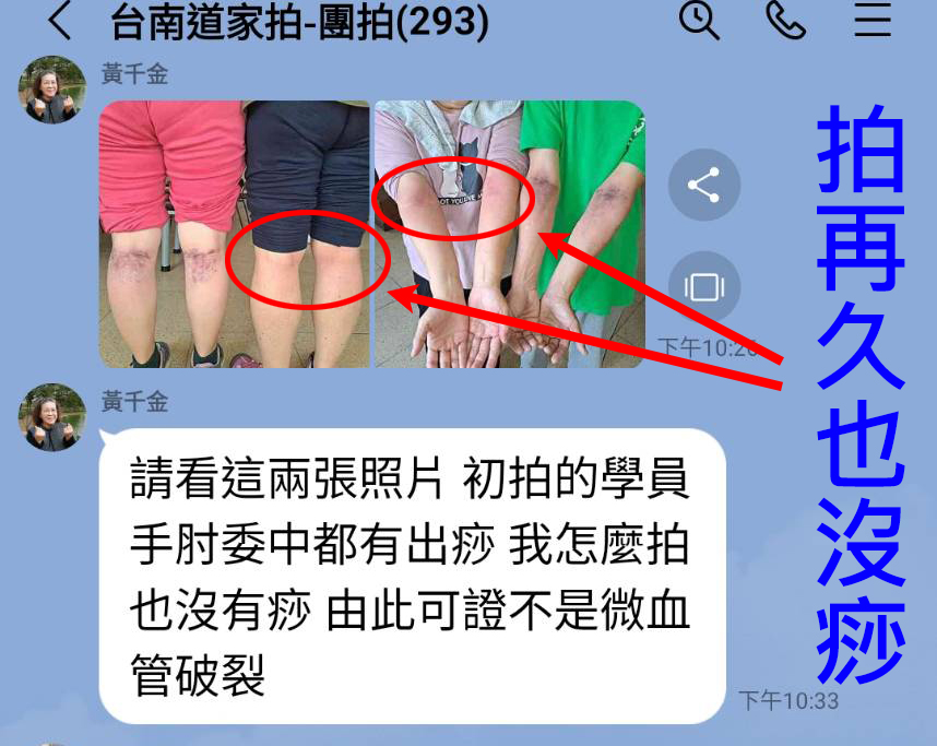 答:這種沒有先引氣血到拍打點,一開始就大力的拍,這樣的拍打做法會有受傷的成份在裏頭,道家拍法一開始都是輕拍引氣血的。
