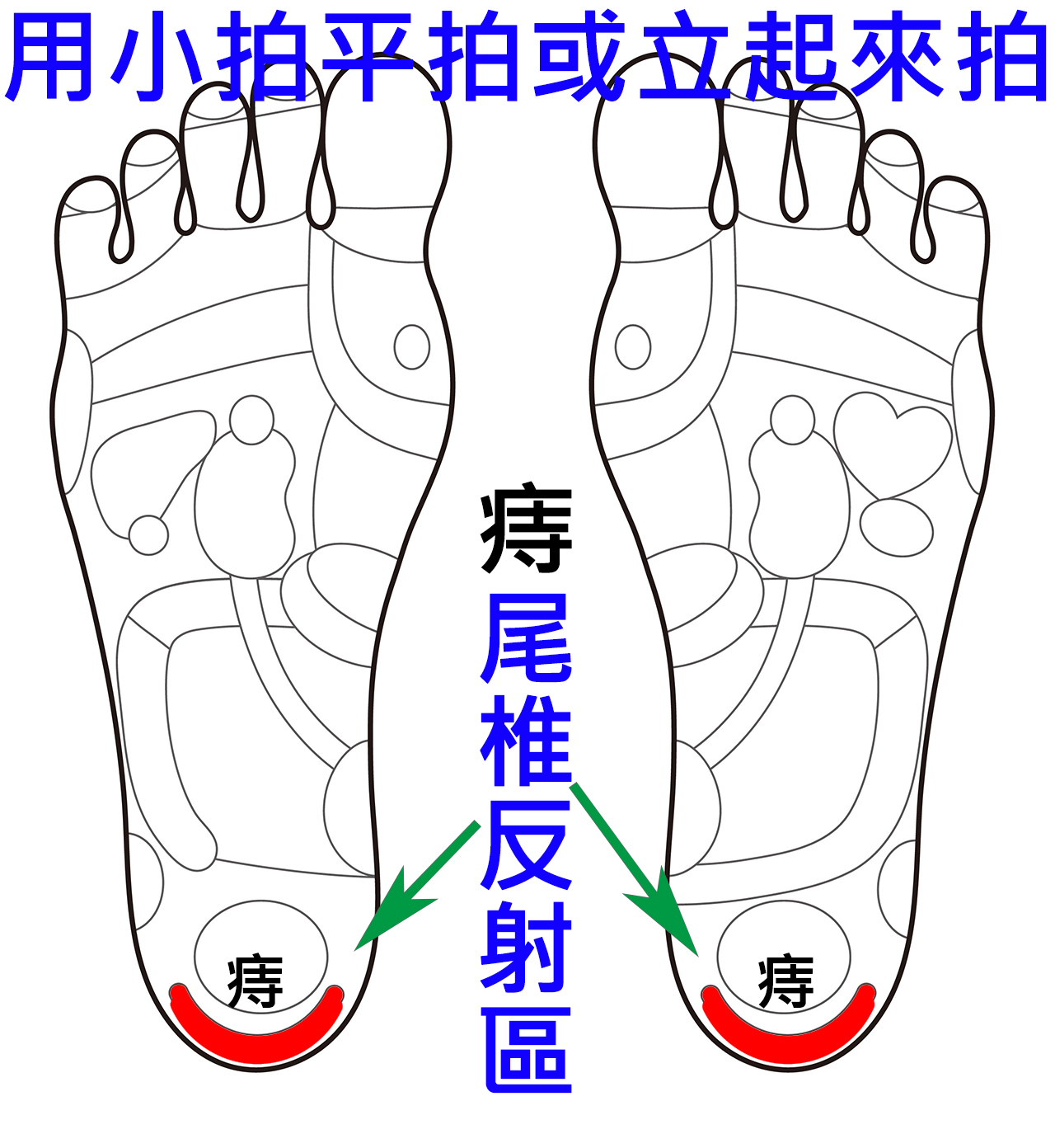腳後跟處是尾椎和痔瘡的反射區,可以二小拍拍,或用一支立起來拍,對痔的症狀有幫助。