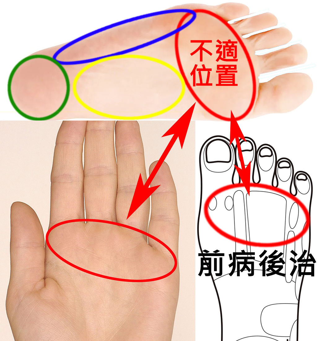 ① 前病後治:四疊拍拍腳背對應位置;