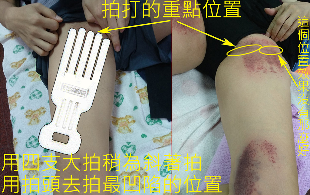 鼠蹊部的拍打,通常會用四疊拍拍打,自拍時則可以用二支小拍疊起來拍打;