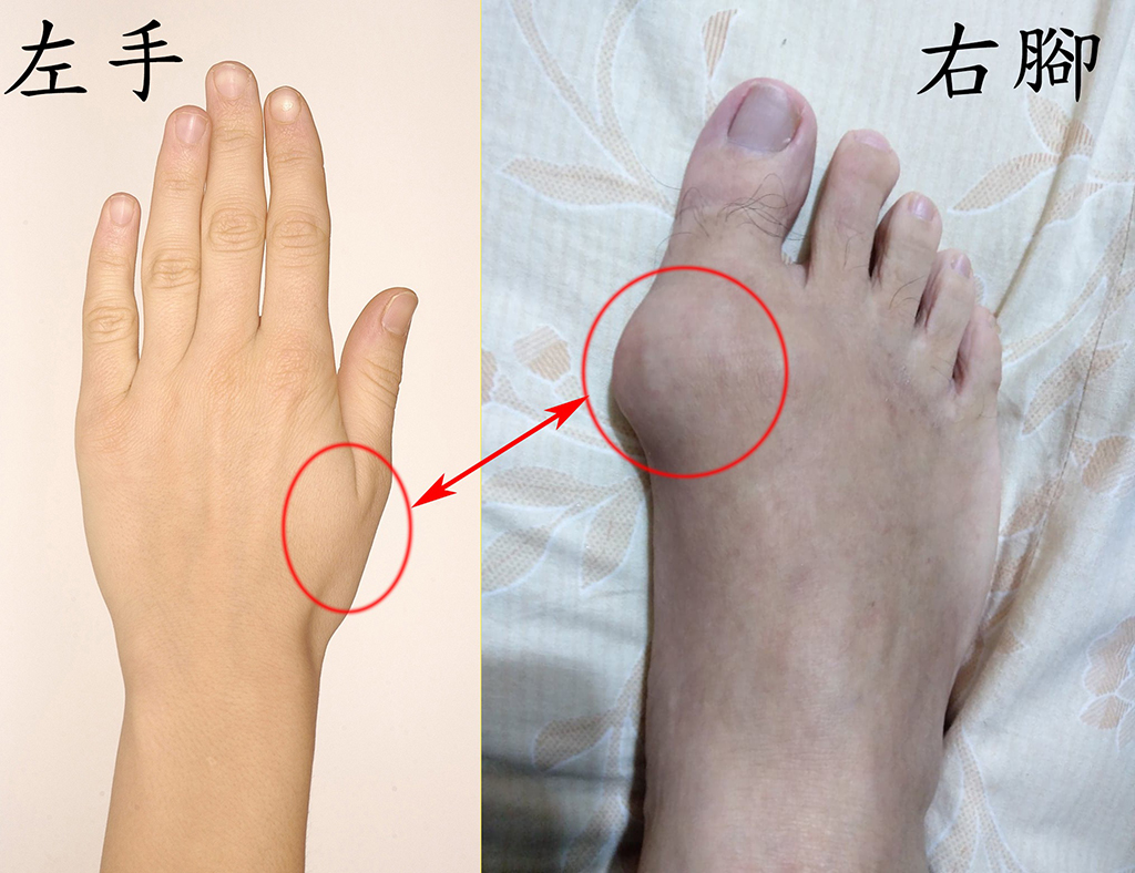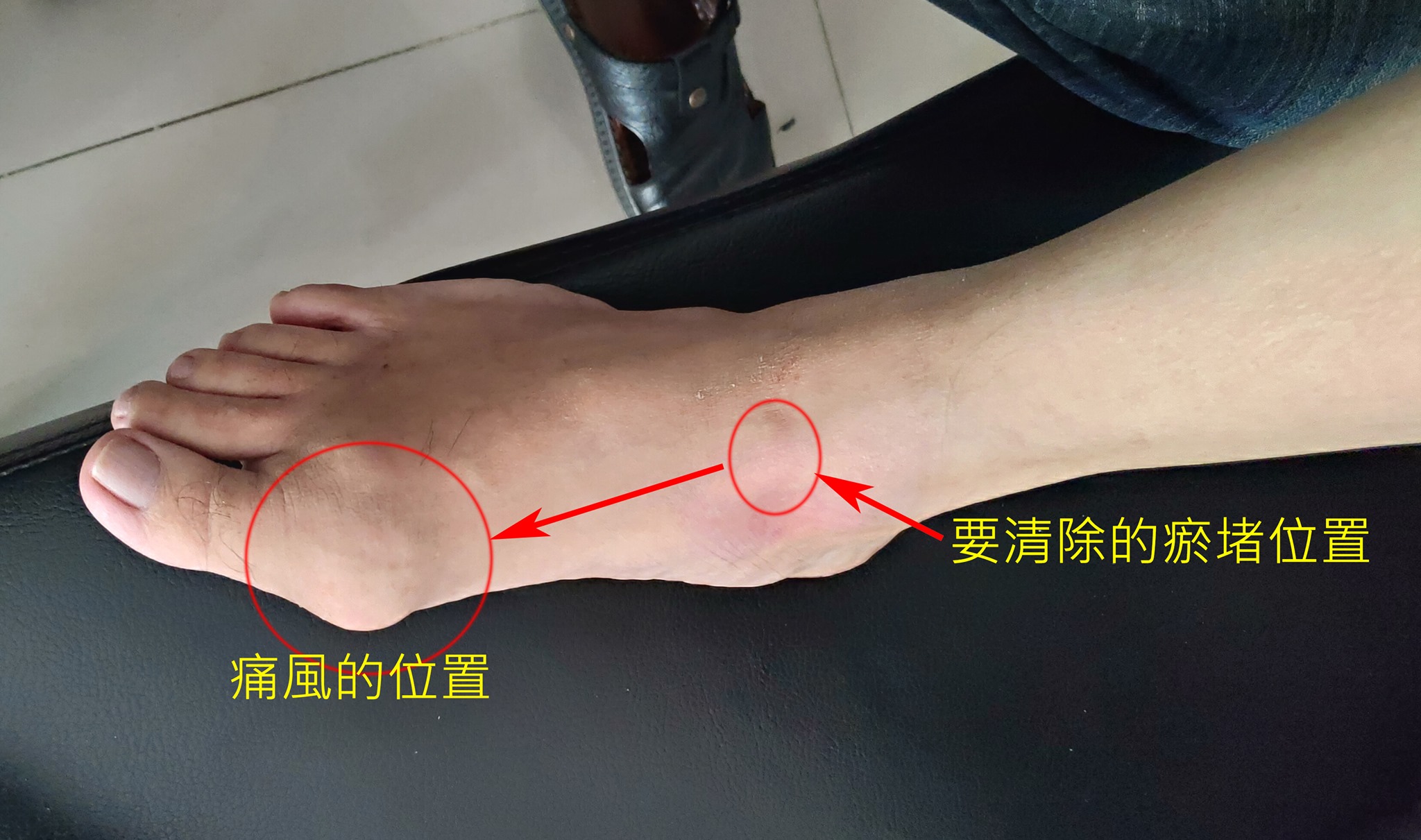 拍打後,結果右腳的大拇指痛風發作了,此时用三把斧頭的方式如下: