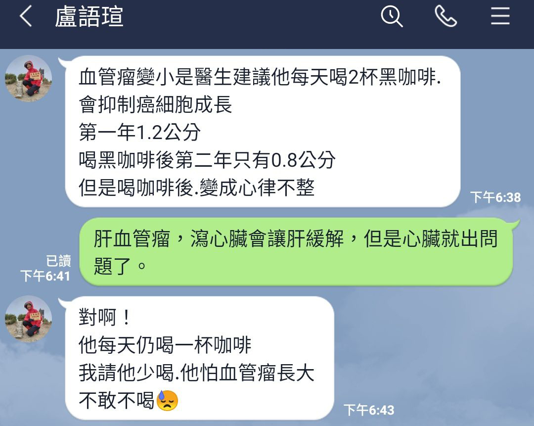 一位拍友的血管瘤症狀,西醫師教他喝黑咖啡來抑製肝血管瘤症狀,結果一年多下來,心臟就出問題了! 肝血管瘤用道家拍法來改善,是很好解決的,就按道家拍的團拍活動拍打就可以了,拍個3-5輪後,血管瘤就會改善了。