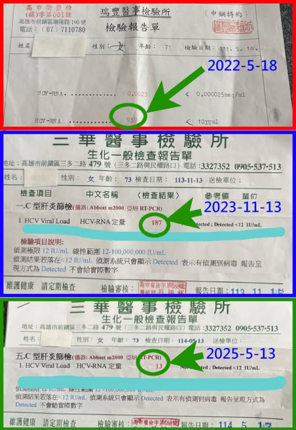 我於去年(113年)經朋友帶領來福壽三信(原美麗島)團拍社群,在未拍打前我有C肝的問題,於111年5月檢查C肝病毒量939(正常值小於12 IU/mL),經過11個月的拍打病毒量降至187,我就開始燃燒起無限的信心,再經過半年(114年5月13日)忍不住再次檢查,昨天(5月17日)拿檢驗報告單,病毒量竟然降到13(接近正常值12,一顆藥丸都沒吃的情況)。