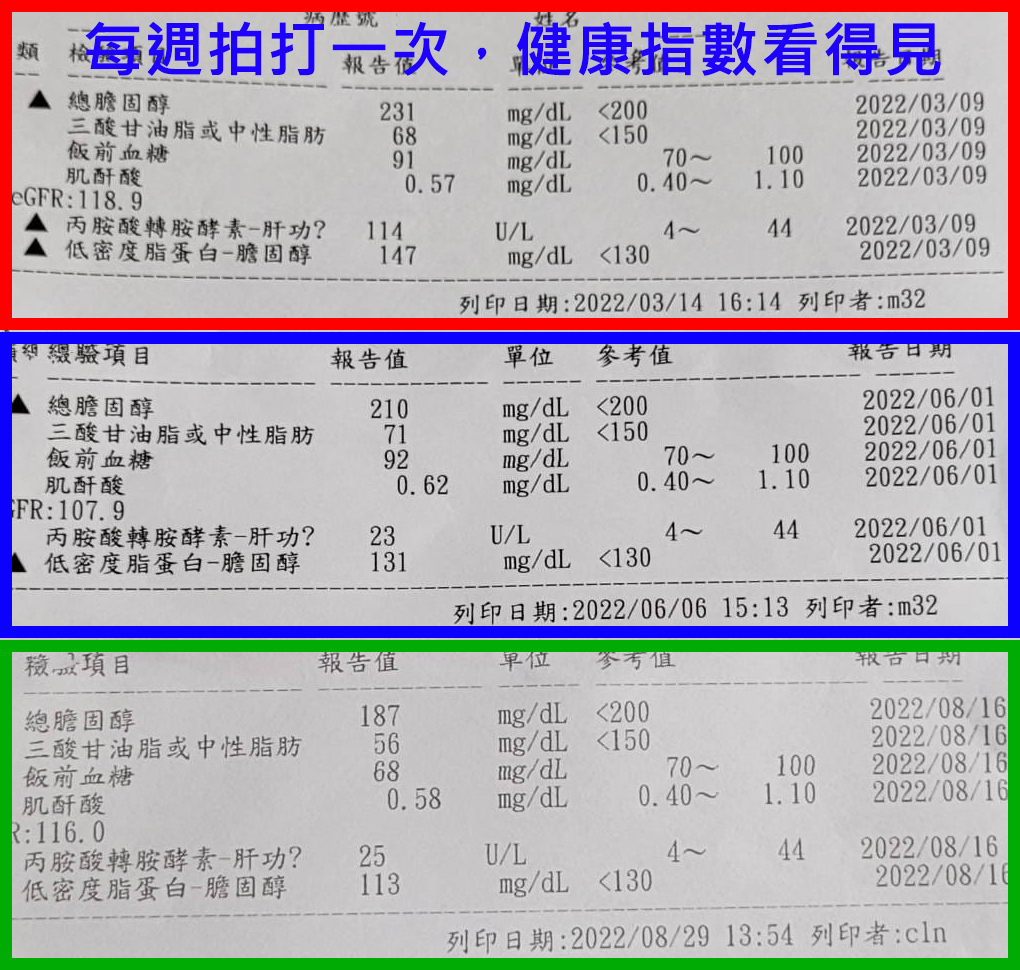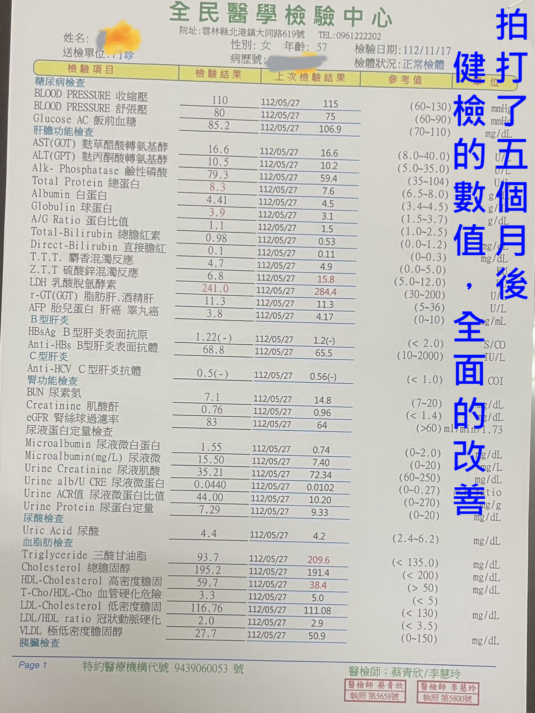 拍了六次後,膽固醇,肝指數,肝炎指數,三酸甘油脂…全都正常