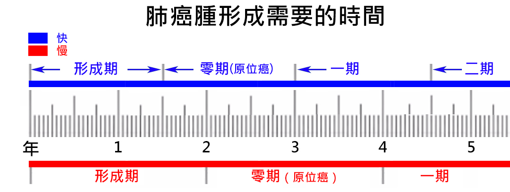 腫瘤形成快的人: 一年半的時間就可以長大到目視可見的零期程度(原位癌),然後再一年半的時間,就會大到西醫學的二期症狀;