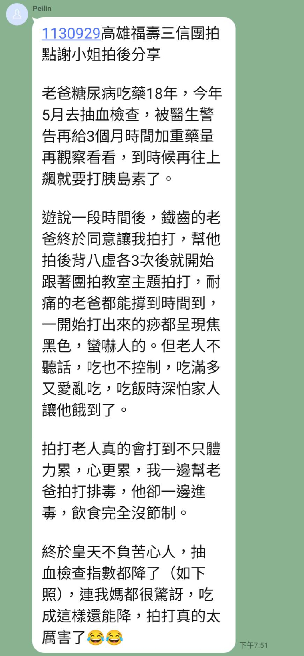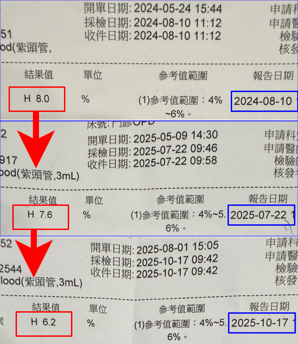 剛開始拍打的時候糖化血色素飆到11,醫生還威脅說要截肢,他打了幾次胰島素就自己決定不打了,繼續拍打反而糖化血色素降到八,醫生還一直問他說:「你真的沒有打胰島素?那怎麼可能會降?」