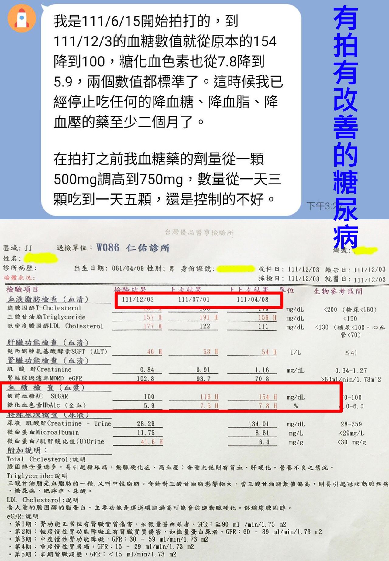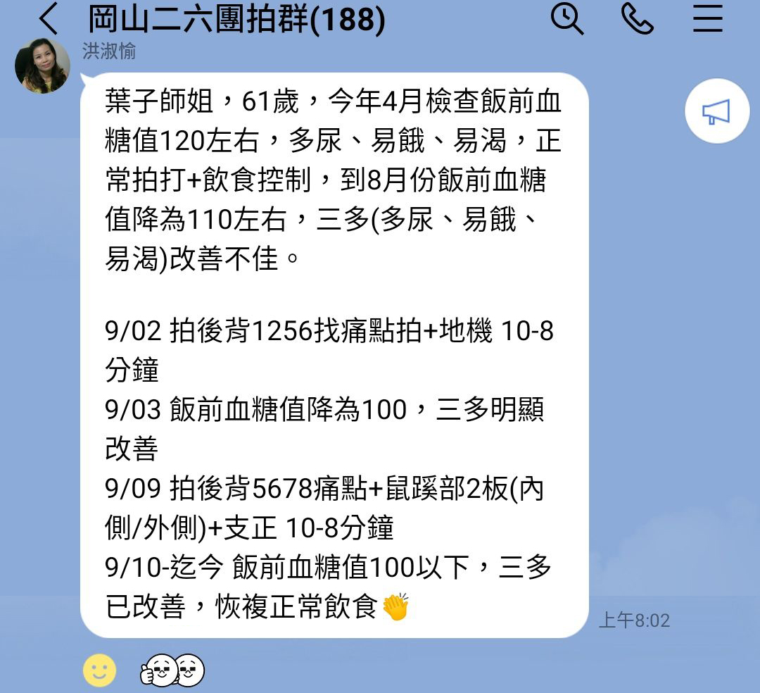未參加拍打前每天運動半小時,飲食控制,血糖問題仍困擾我,糖尿病造成腎絲球過濾率出狀況;