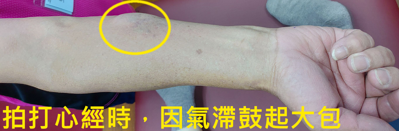 拍打後出痧有鼓脹的情形時,為氣滯的表現,或是腫塊是氣滯造成的,尤其是前額頭,手背,腳背,後背,最容易有鼓包的情形;