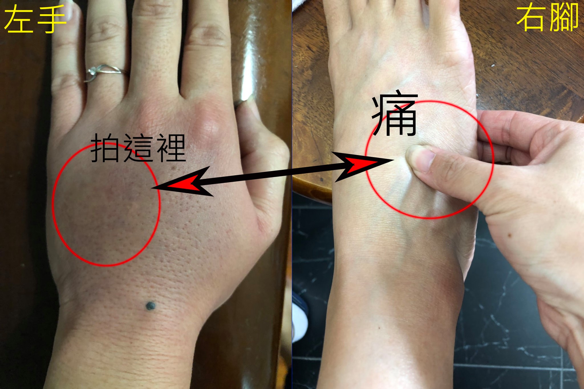 腳背有不適的情形,拍對側手背對應的位置改善;