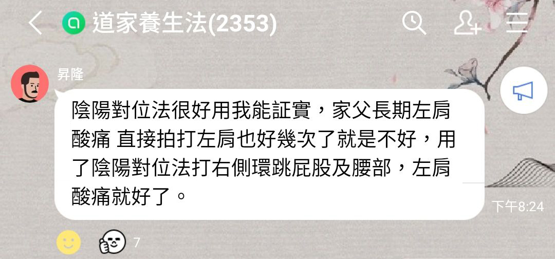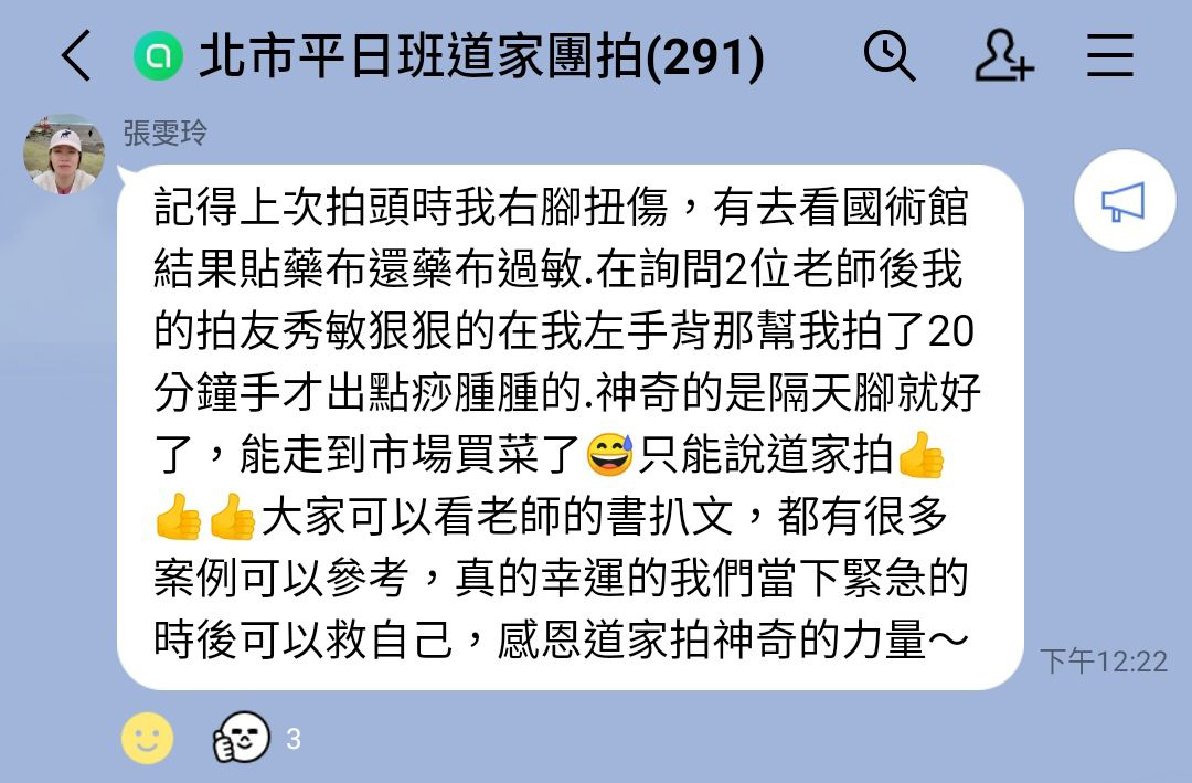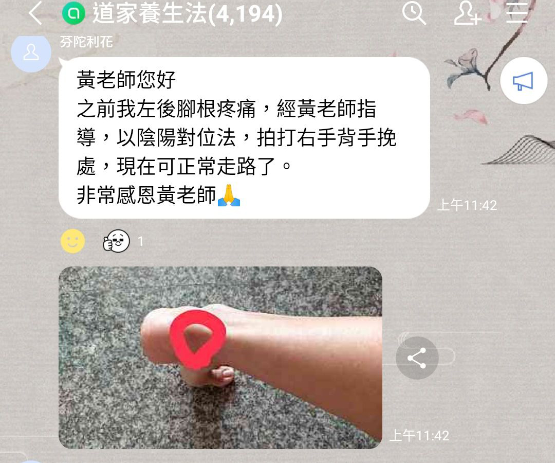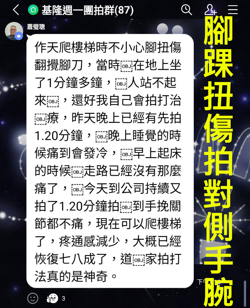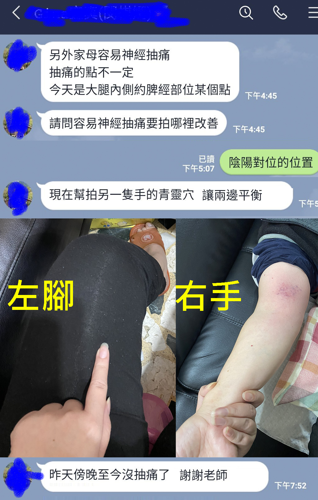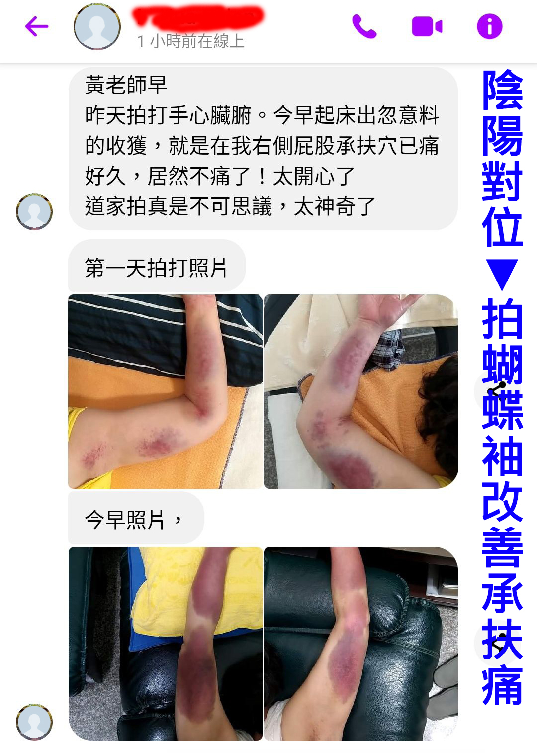用道家拍法的三板斧改善,只拍了陰陽對位的右腳足三里,就改善了近九成;