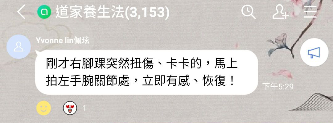 前幾天這位五十二歲的拍友,她左手的大魚際附近會酸痛,痛到影響睡眠,當拍了整條肺與大腸經和陰陽對位的右腳大拇指相關位置後改善了。