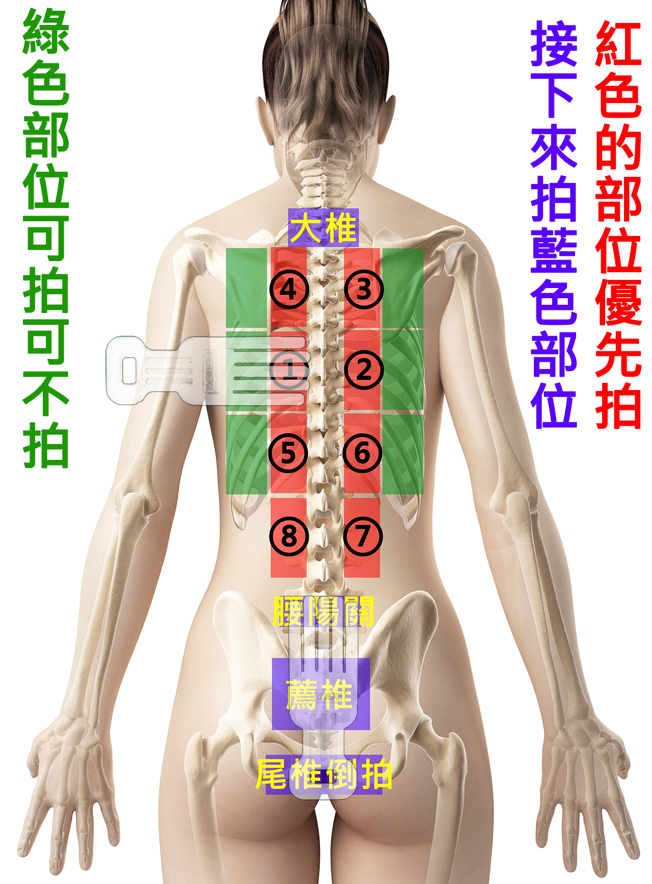 問:可否今天拍後背的1234位置,然後改天再拍後背的5678位置?